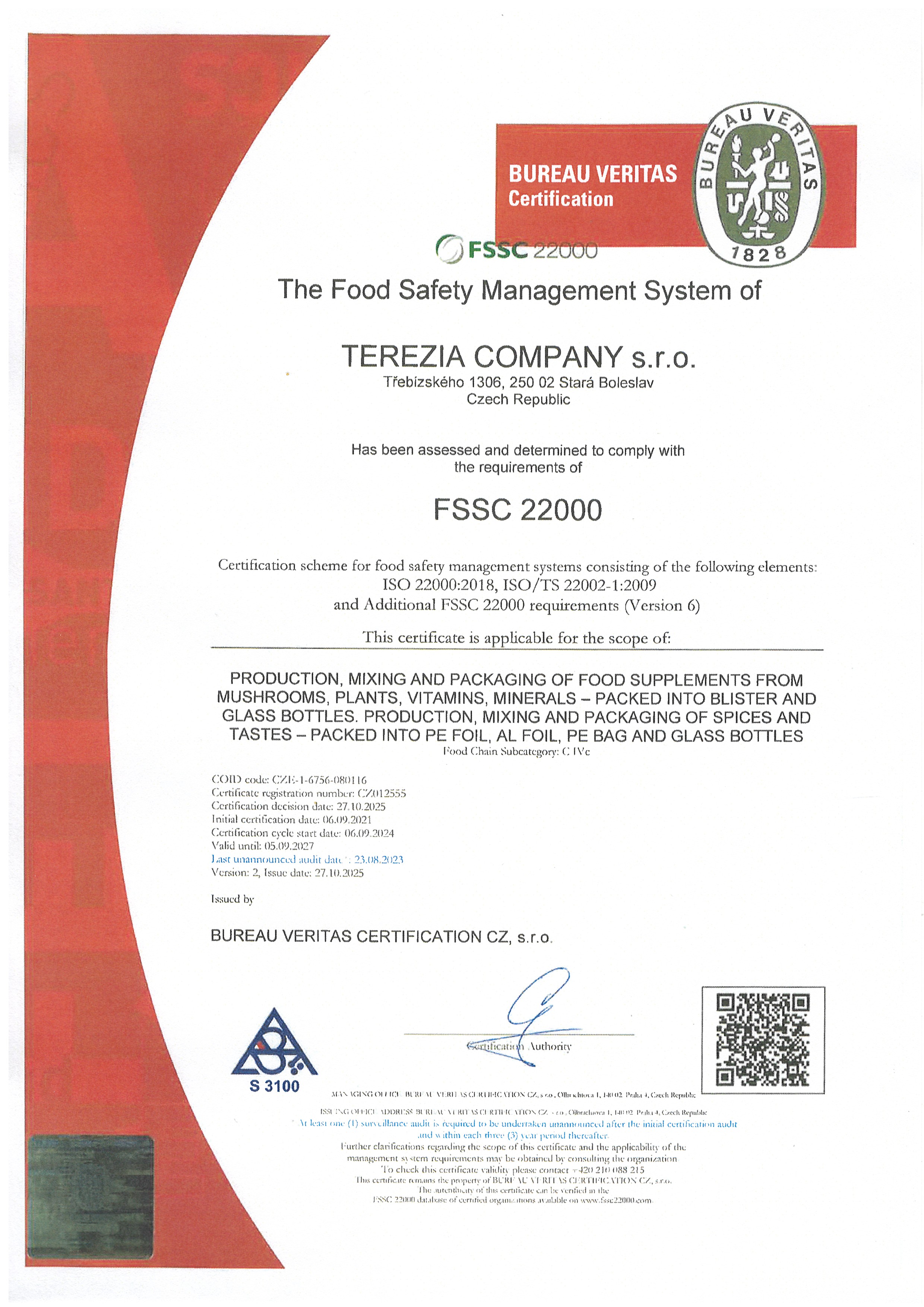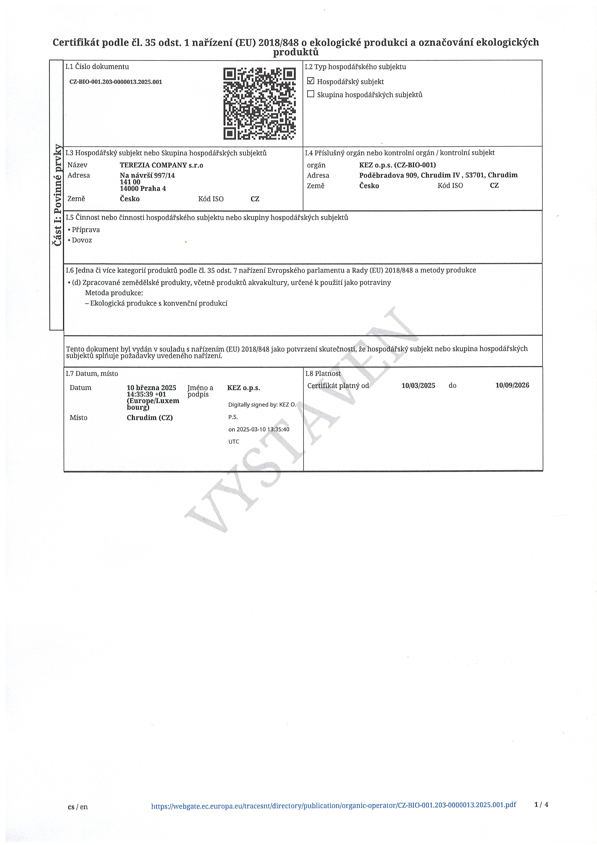 El certificado es emitido por la empresa KEZ o.p.s, que es la primera organización checa acreditada de inspección y certificación, que garantiza un control y certificación profesional independiente en el sistema de agricultura orgánica para, por ejemplo, productores de BIO alimentos, comerciales de BIO alimentos y BIO productos y productores de sustancias que no contienen componentes agrícolas (abonos, minerales y piensos suplementarios). Nuestros productos certificados KEZ garantizan BIO calidad con estándares más astrictos.