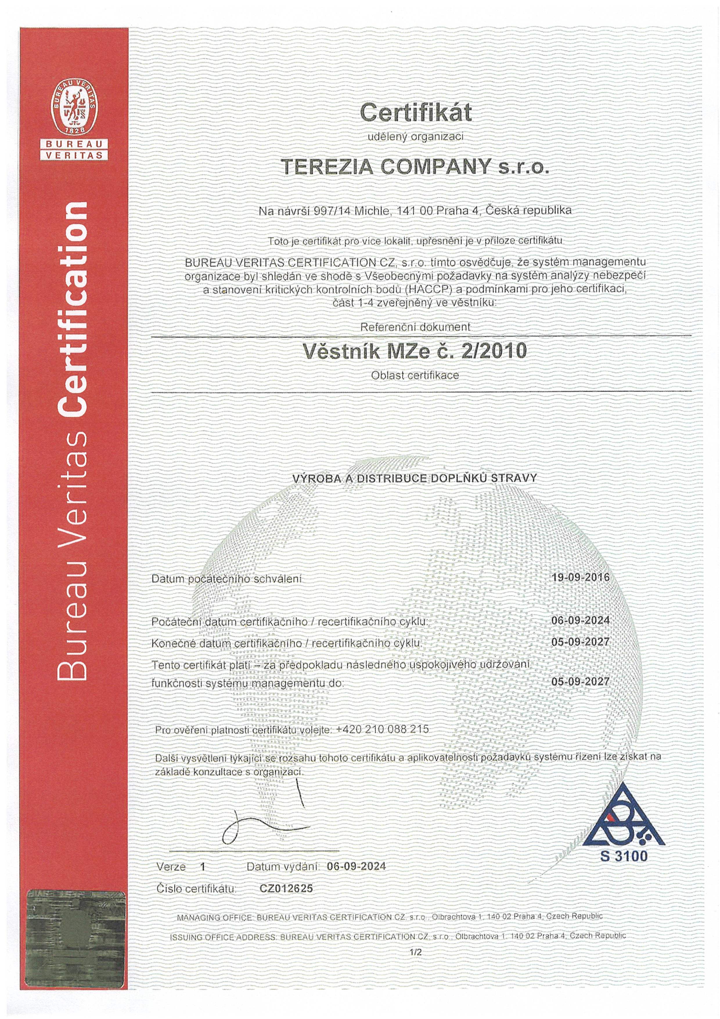 El certificado es emitido por la empresa KEZ o.p.s, que es la primera organización checa acreditada de inspección y certificación, que garantiza un control y certificación profesional independiente en el sistema de agricultura orgánica para, por ejemplo, productores de BIO alimentos, comerciales de BIO alimentos y BIO productos y productores de sustancias que no contienen componentes agrícolas (abonos, minerales y piensos suplementarios). Nuestros productos certificados KEZ garantizan BIO calidad con estándares más astrictos.